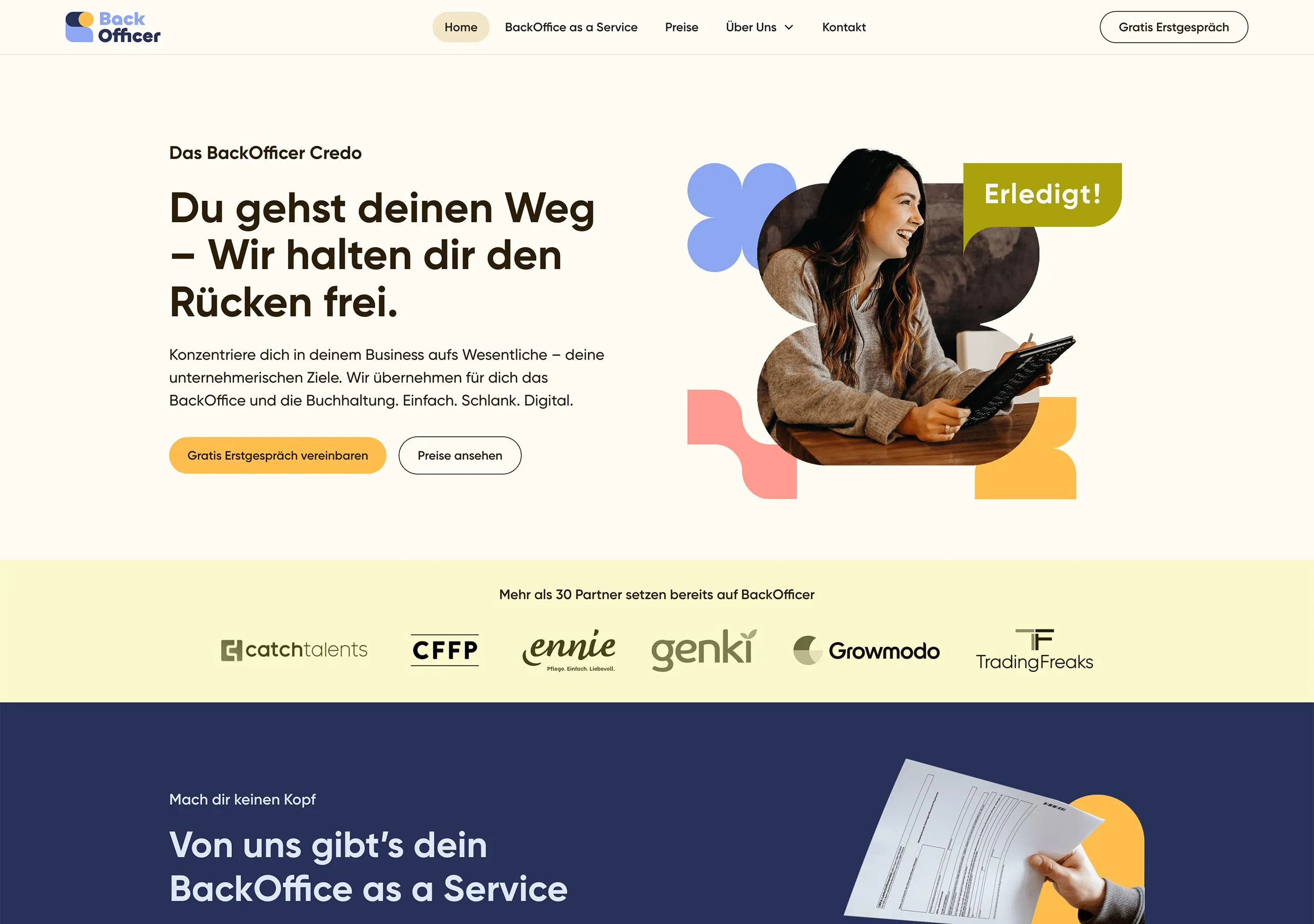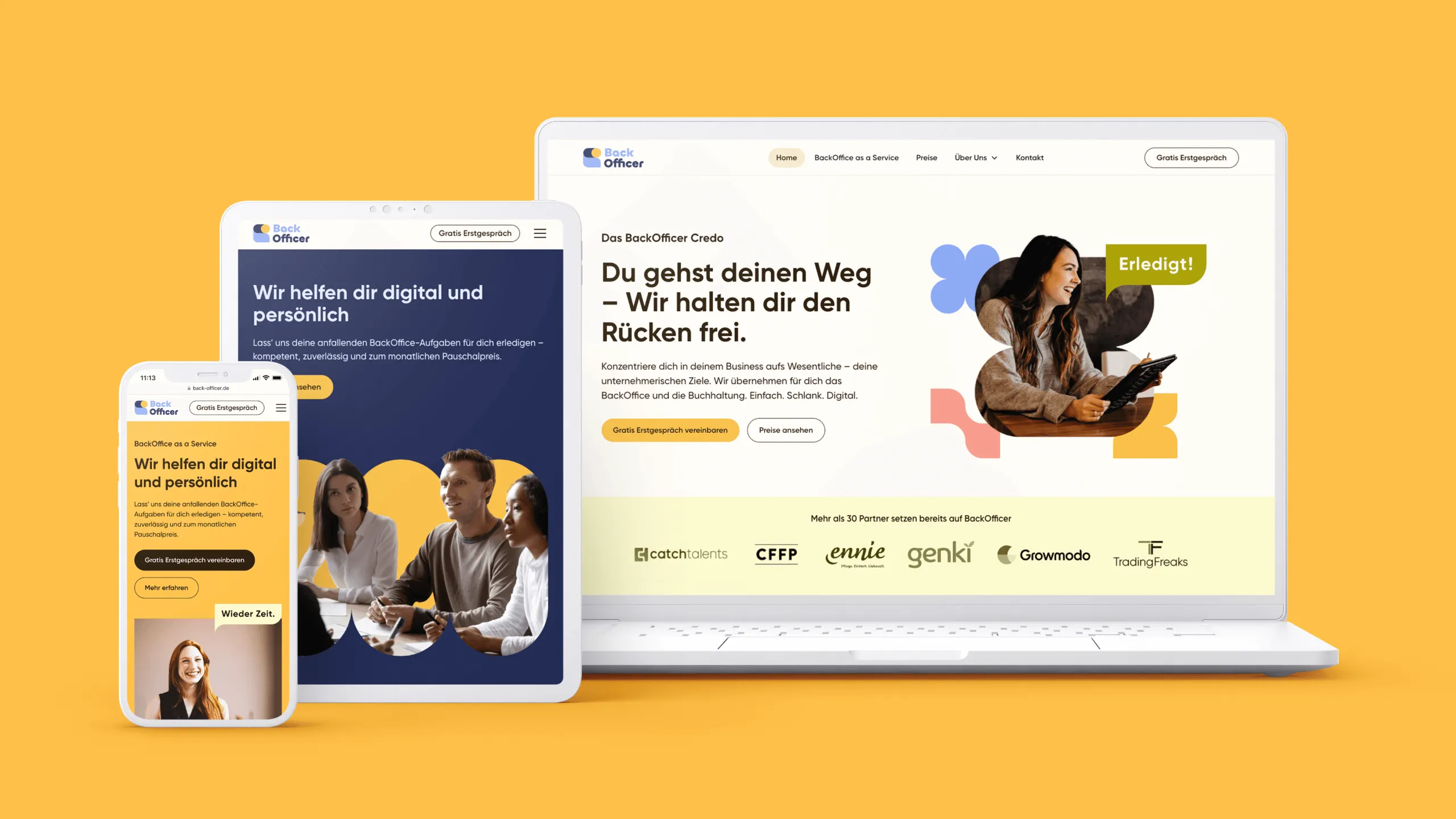 BackOfficer helps young and medium-sized companies to manage their back office tasks. Through a fully digitized process, the company takes over the administration and accounting of its customers so that they can better focus on their business goals. Our task was to give BackOfficer a new look and feel. The old corporate design was replaced by a completely new brand. The word-image brand, colors, typography, brand voice, key visuals and imagery were revised. The first medium to be redesigned was the entire website. The result was a flexible design system that communicates the brand's goals efficiently and can be easily implemented internally at BackOfficer. Various libraries and guidelines were created to ensure a smooth transition.