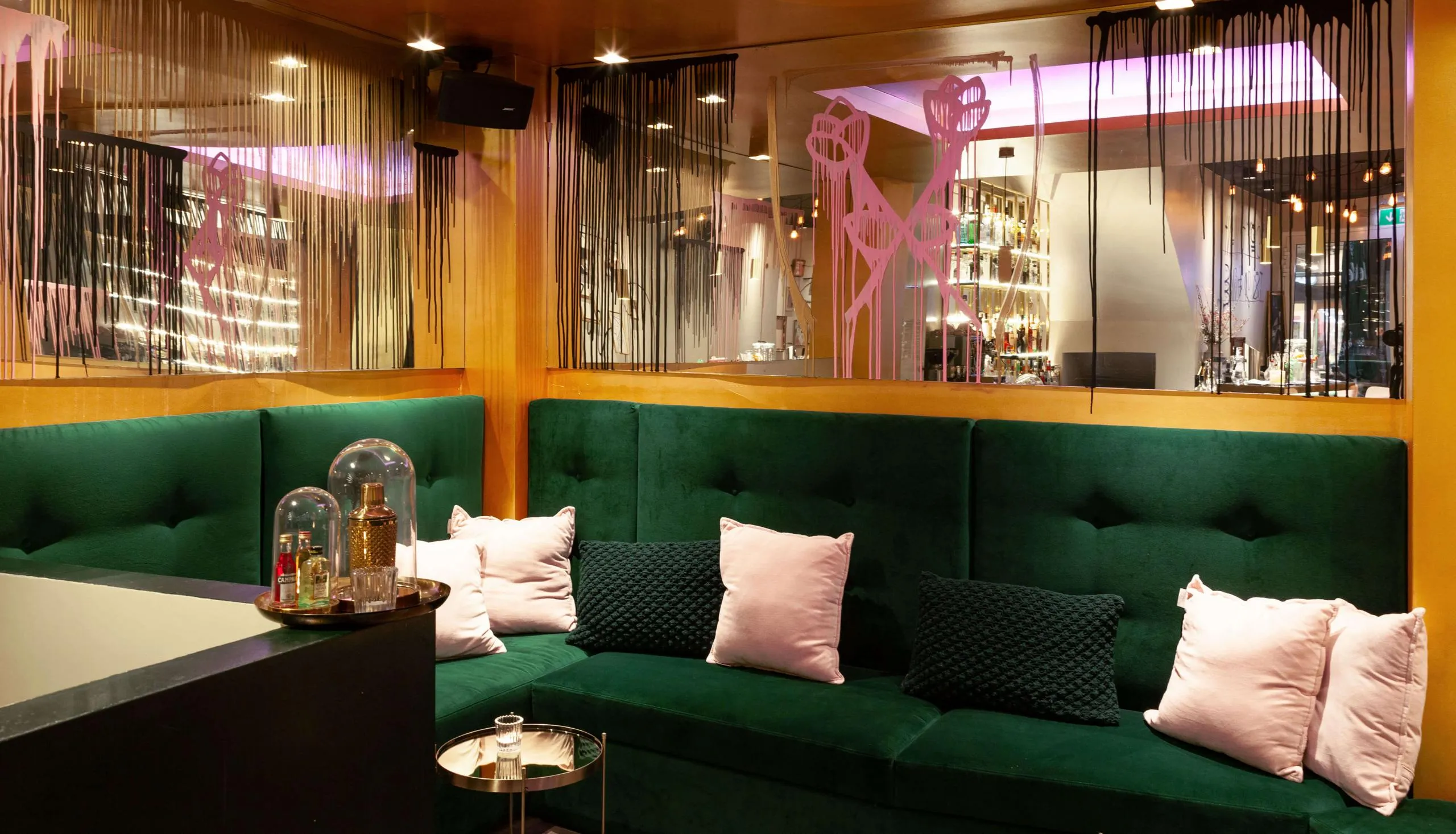 With its heraldic theme, the design concept picks up on the umbrella brand of the parent company Graf Adolf Apartments parent company. The graphics and interior are wilder, louder and younger in their color and design language, appropriate to the location and the audience - green velvet mixes with pink and bronze.