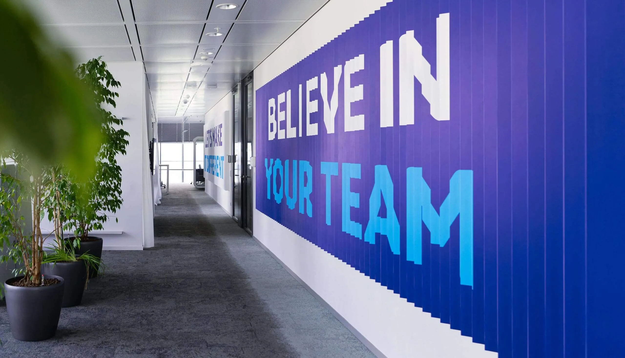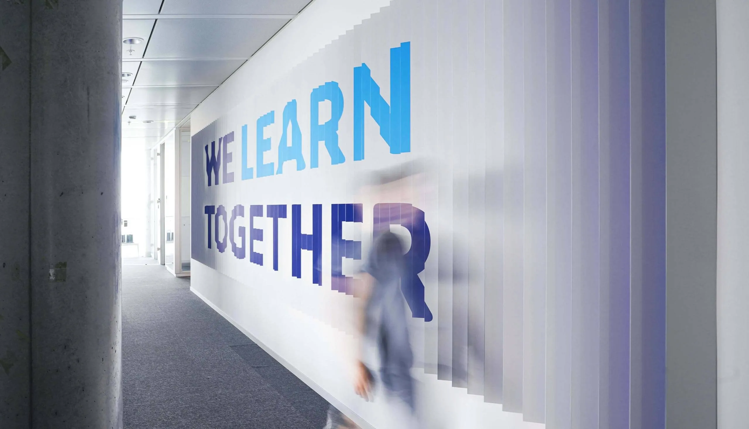 In a "branded workspace," employees returning from lockdown can experience them emotionally in the room. The motto "We change the game" and various motivational messages guide them through the floors. The employees not only grasp the statements superficially, but are also encouraged to make an inner change, which in the next step should also have an impact on the company's customers.