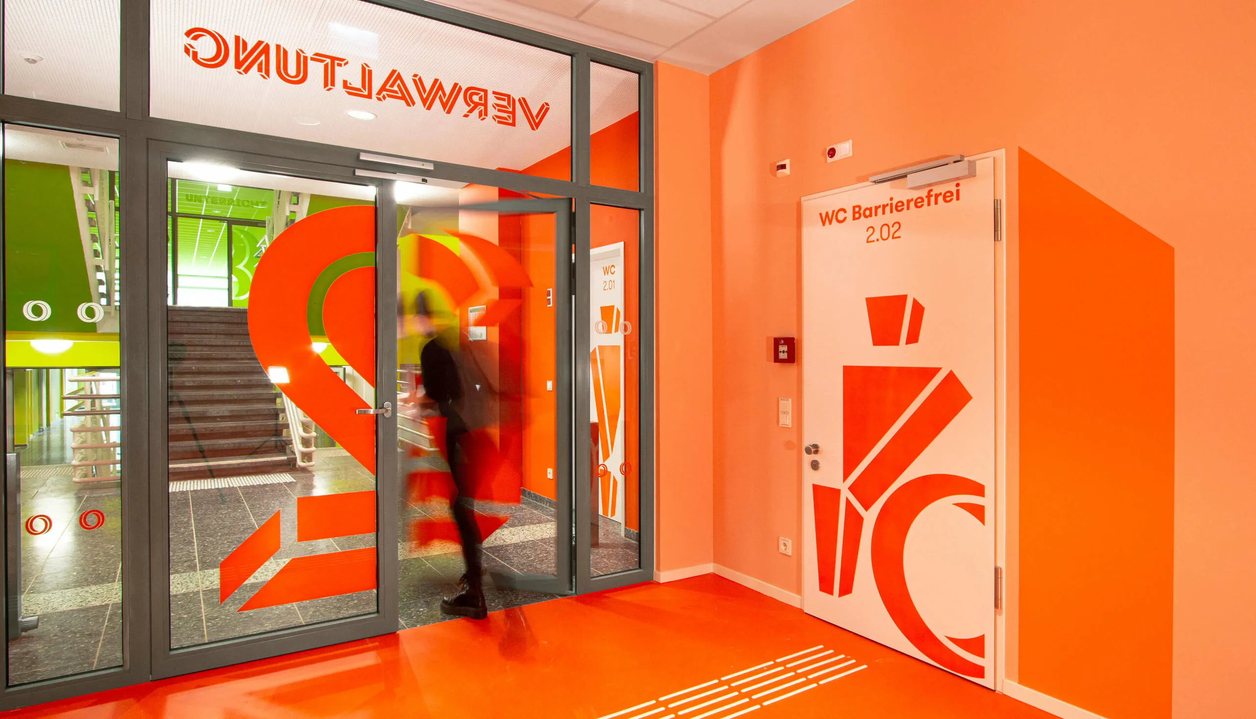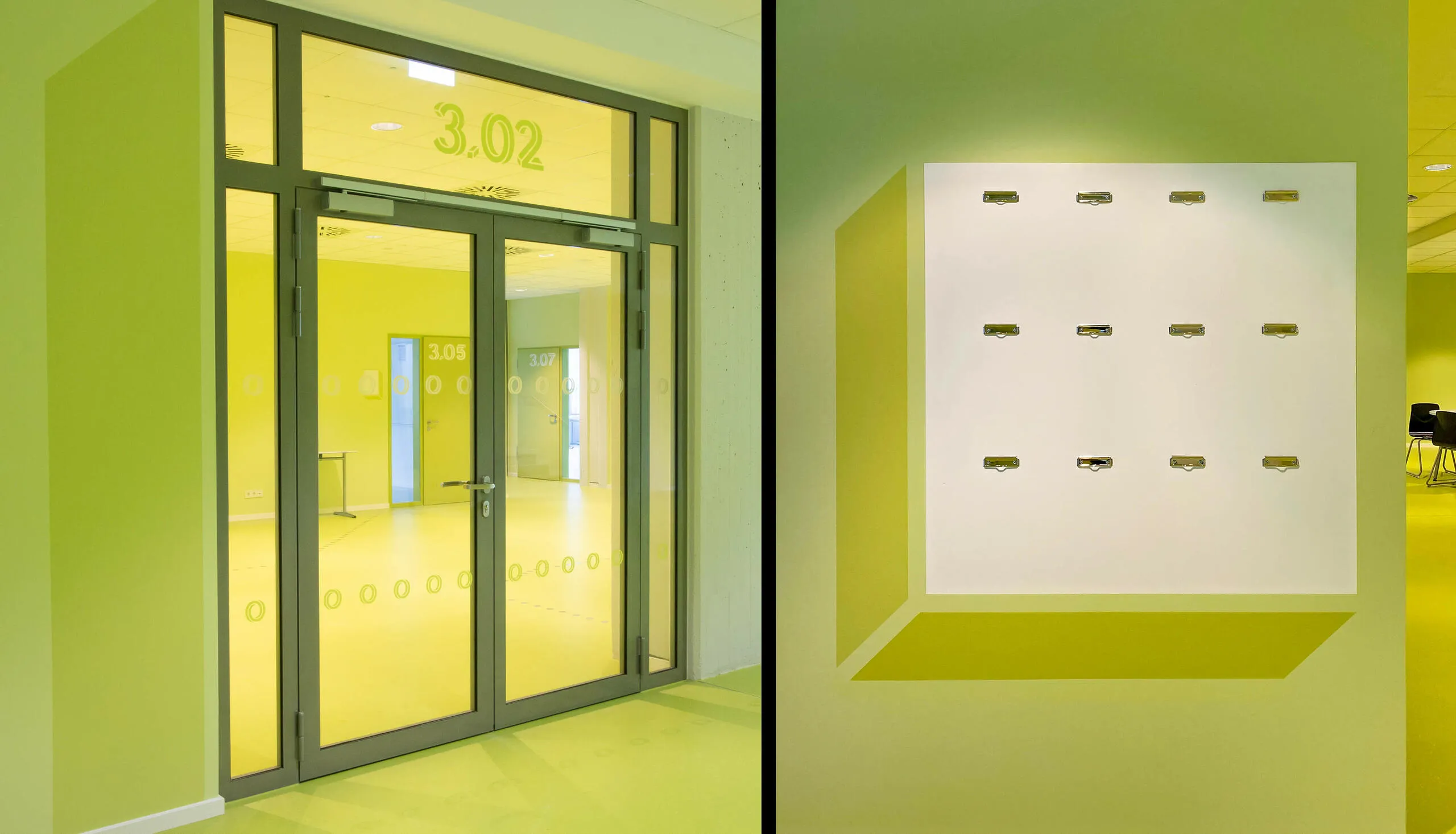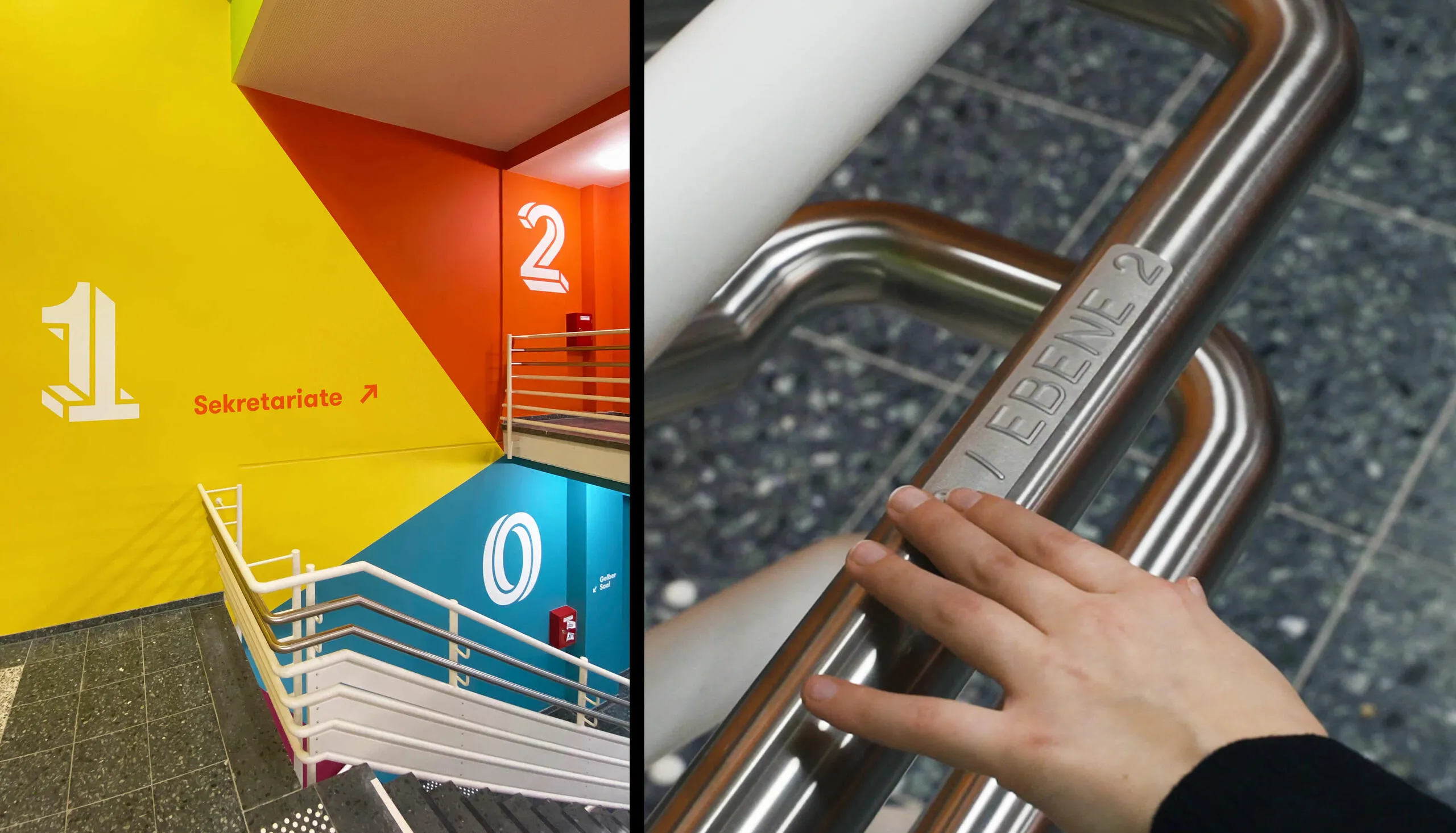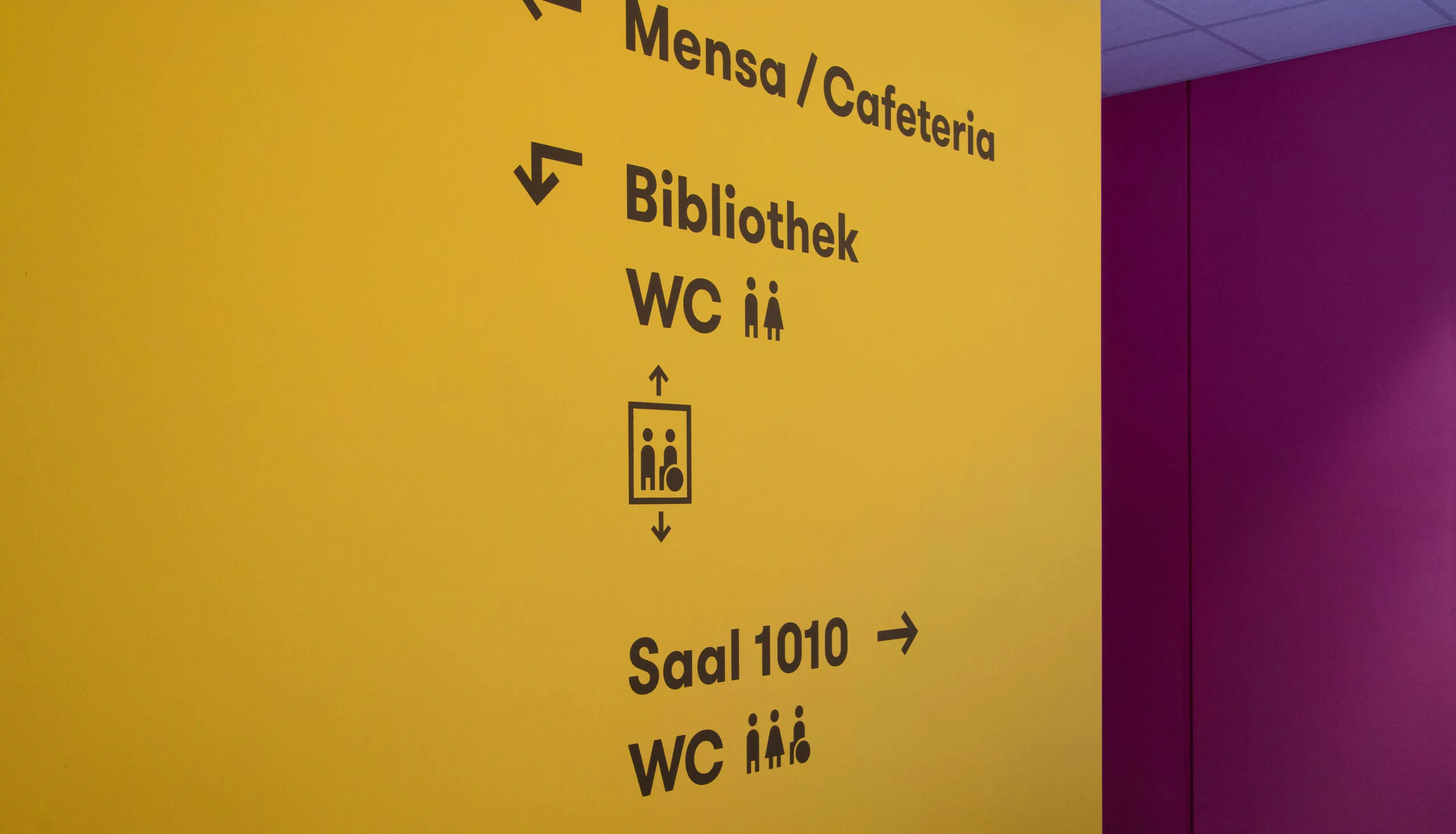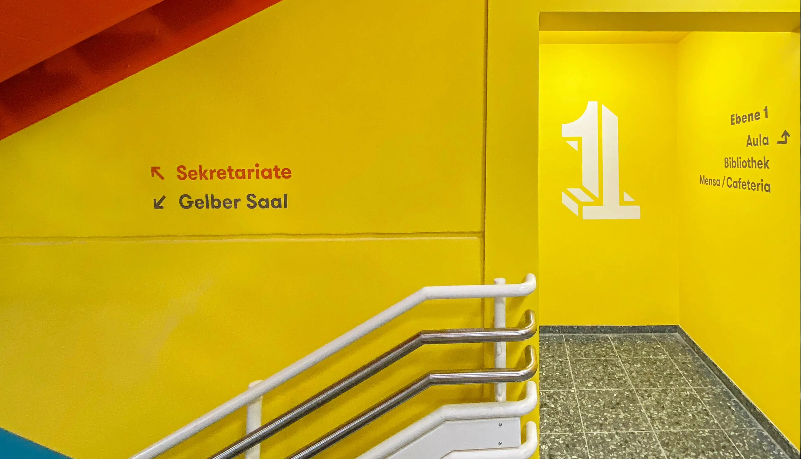 This individual and identity-creating wayfinding and orientation system was developed by us in close and early coordination with the user, client and architect. Striking typography and clear color coding solve the challenge of split-level architecture.