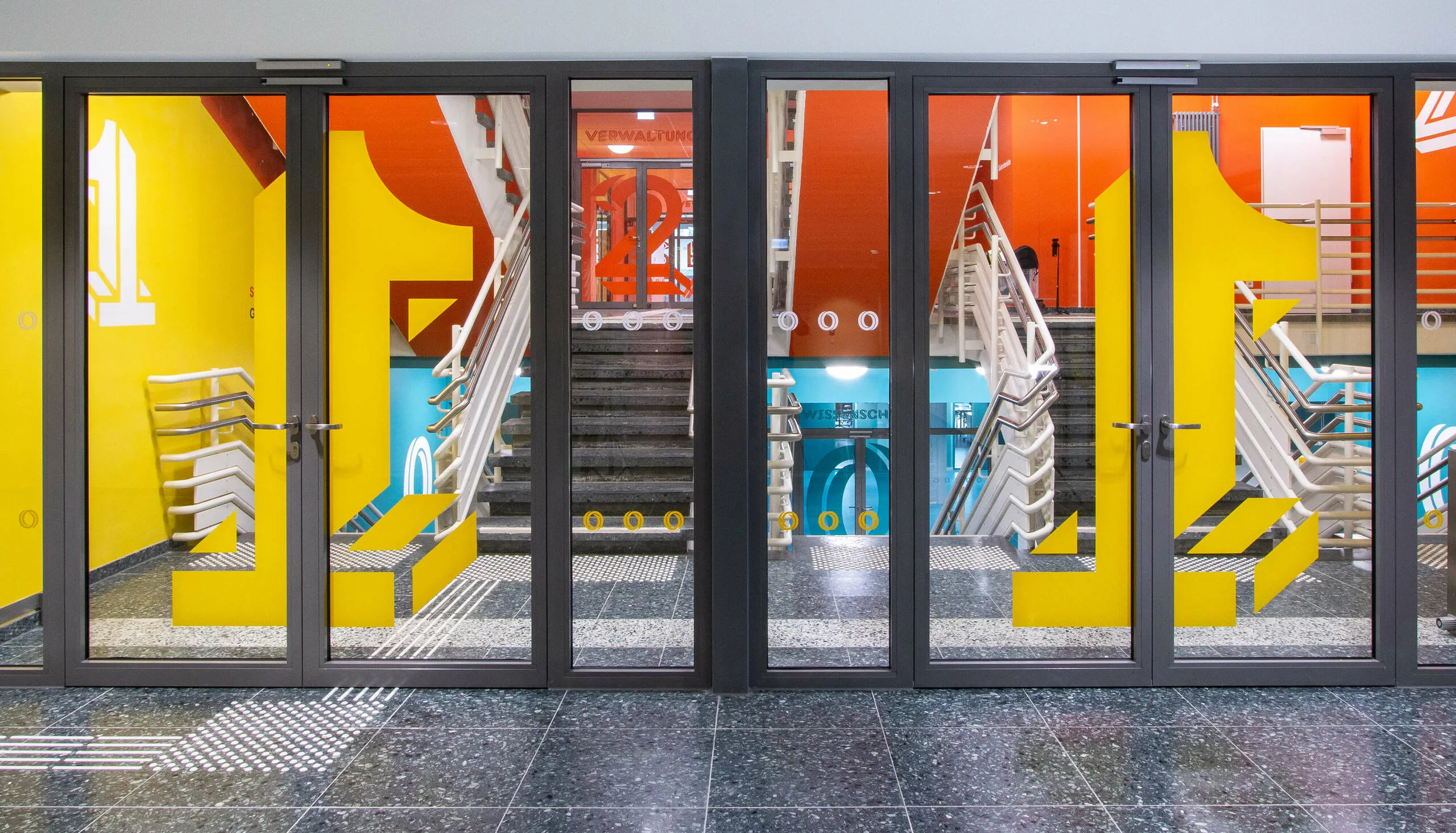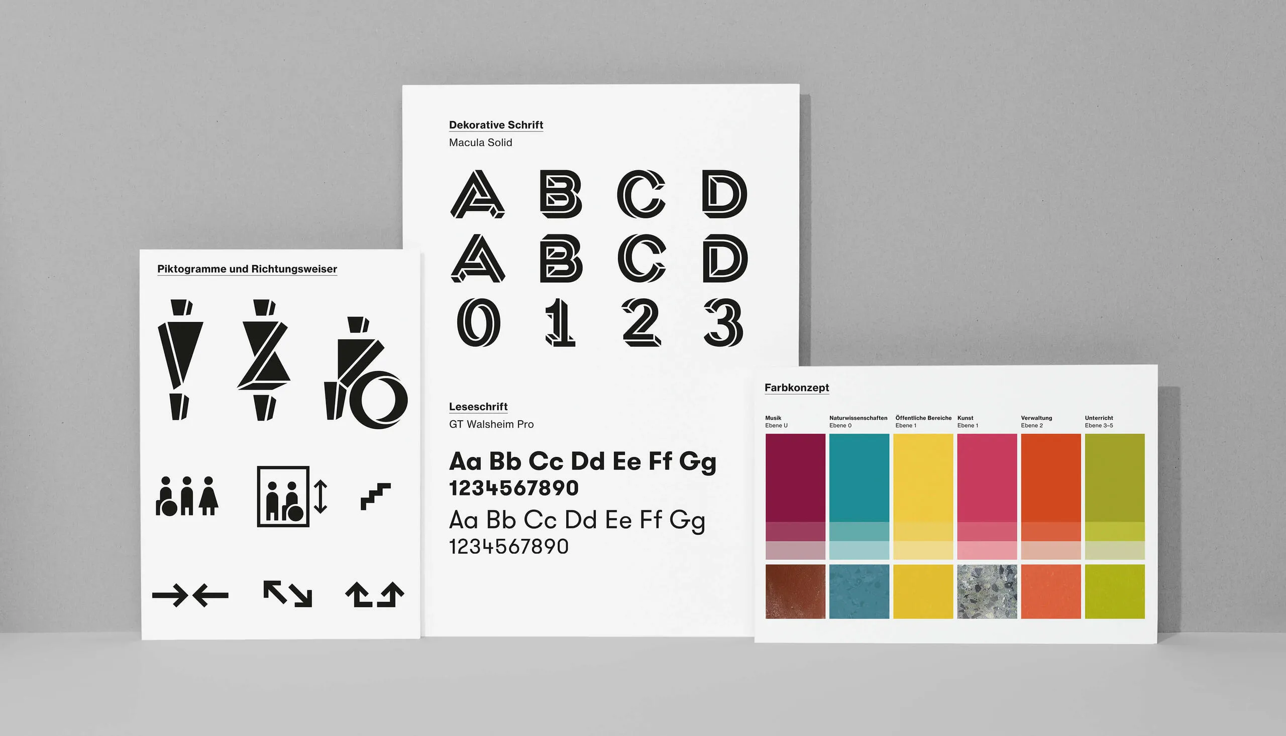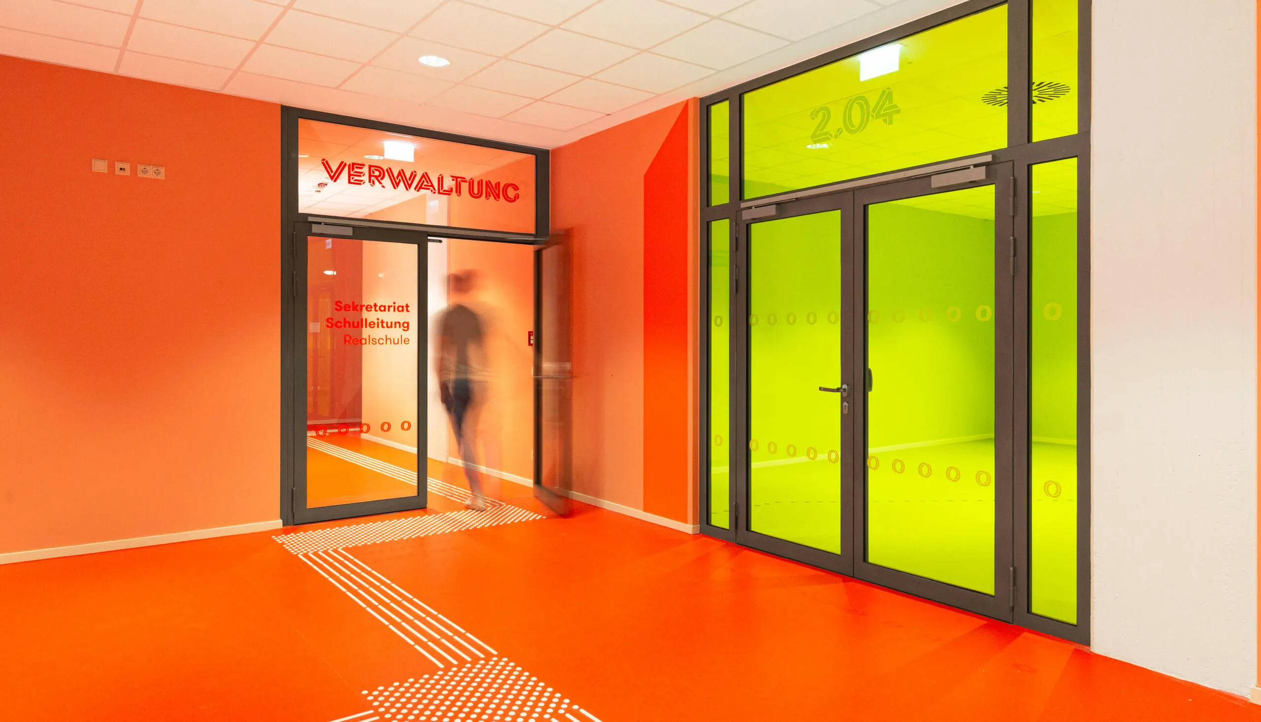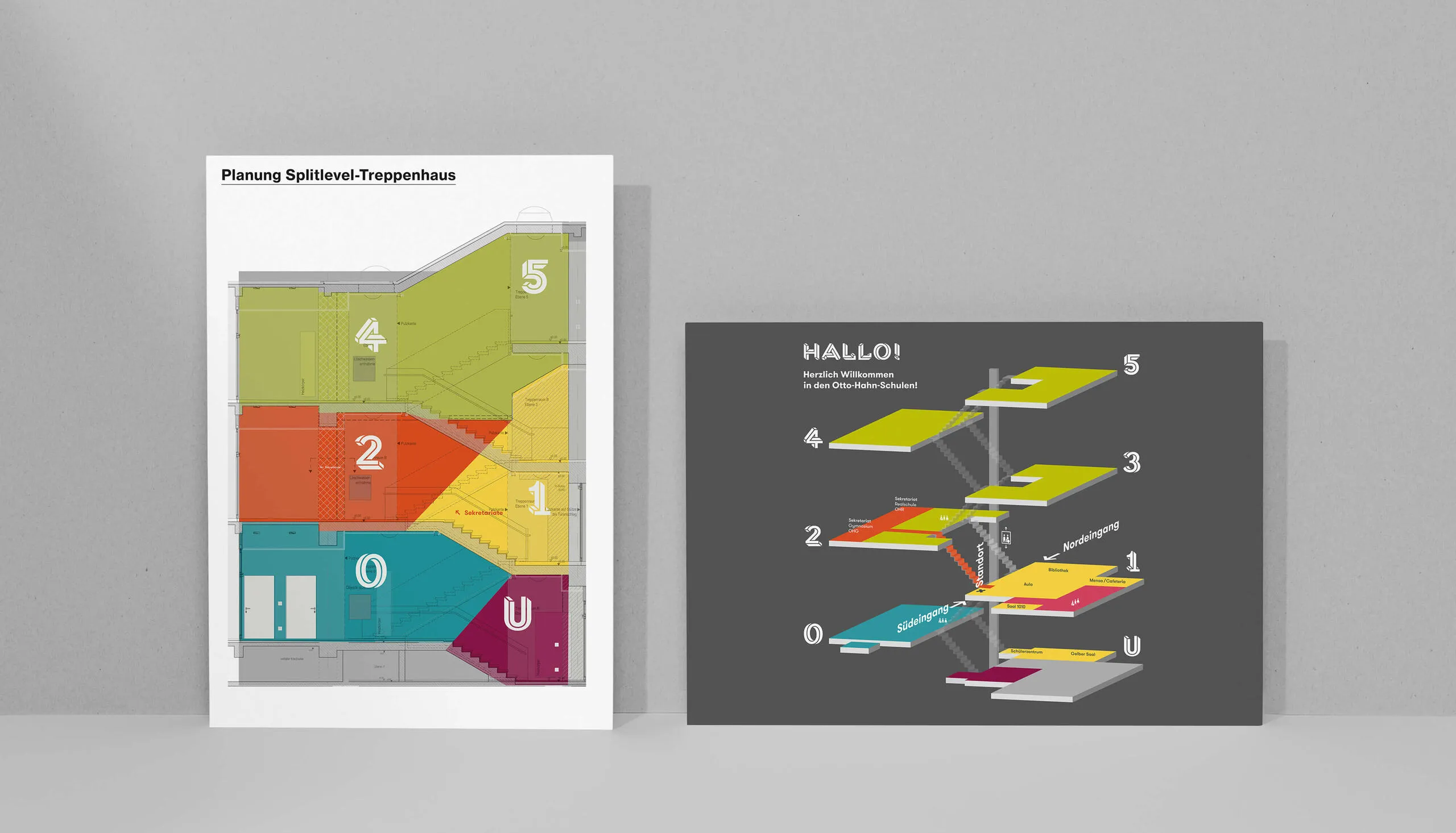 This individual and identity-creating wayfinding and orientation system was developed by us in close and early coordination with the user, client and architect. Striking typography and clear color coding solve the challenge of split-level architecture.