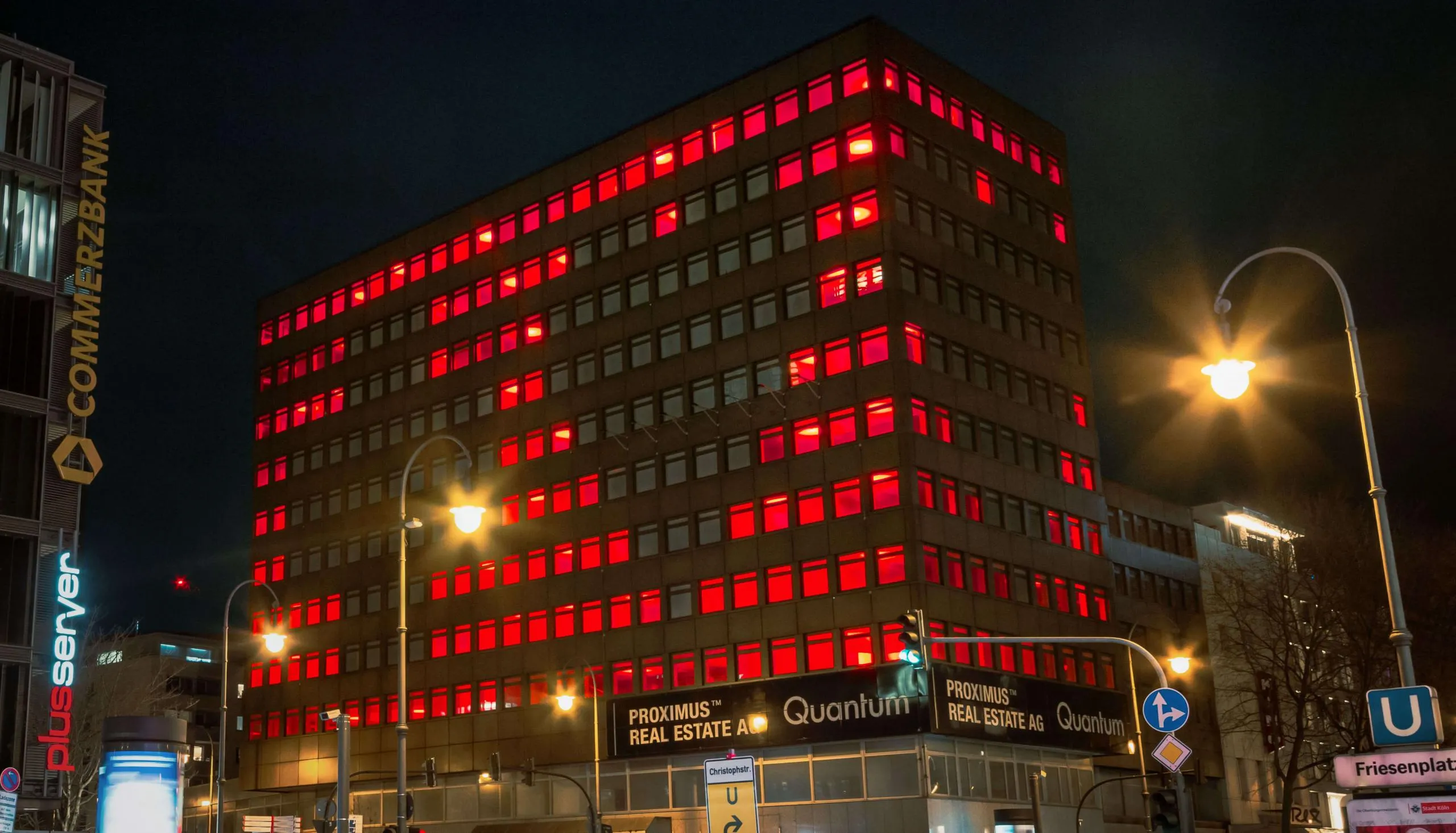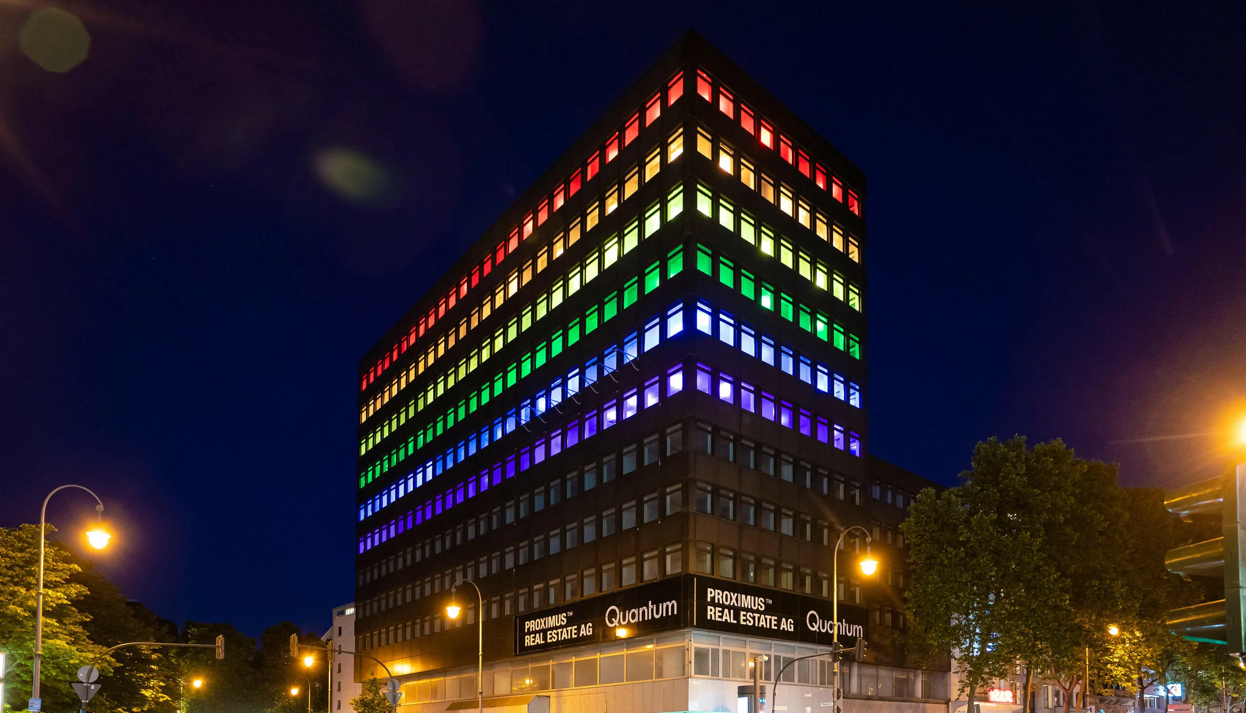 From January 2021 to June 2022, we used the vacant high-rise building of Proximus Real Estate AG on Friesenplatz in Cologne to visually convey values such as cohesion, a sense of community, appreciation, tolerance and peace in a time of crisis. With a great response in the press and social networks, the facade of the building was thematically illuminated in four different actions.