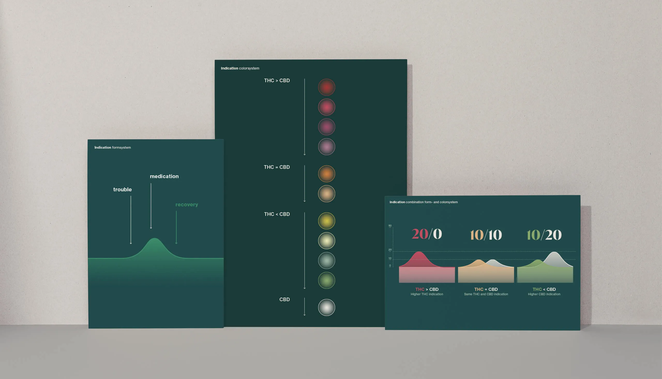 Unmissverständliche Farbkodierung und dezente Infografiken in Form von Amplituden stellen die Intensität von THC- und CBD-Anteilen dar und kommunizieren die klare, medizinische Seriosität dieses verschreibungspflichtigen Medizinproduktes.