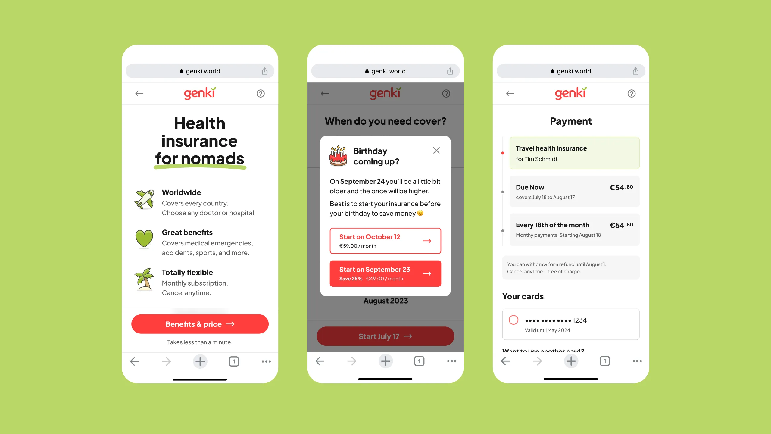 Genki, ein stark skalierendes dynamisches Startup im Bereich der Krankenversicherungen für digitale Nomaden, stand in seiner Seed Phase vor einer entscheidenden Herausforderung. Es fehlte eine kohärente und skalierbare Designlösung. Als Design Agentur erkannten wir das Potenzial und traten ein, um wertvollen Input zu bieten: